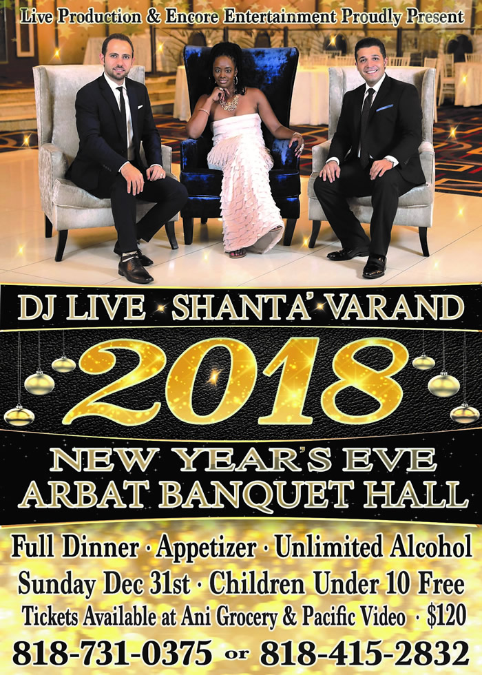 SUNDAY , DEC 31, 2017 AT 8:00 PM With one and only: VARAND, SHANTA and, DJ LIVE Adults: $120, Children under 10: FREE / Full Dinner / Appetizer / Unlimited Alcohol Santa Clause & Entertainment Characters. Address: 711 S San Fernando Blvd, Burbank, California 91502 . Tickets are available at: PACIFIC VIDEO, ANI GROCERY. For more info: (818) 415-2832 OR (818) 731-9036 . It will be an honor to have your presence and celebrate 2018 with class and style. We are ready for another year of countdown and celebration!!!"